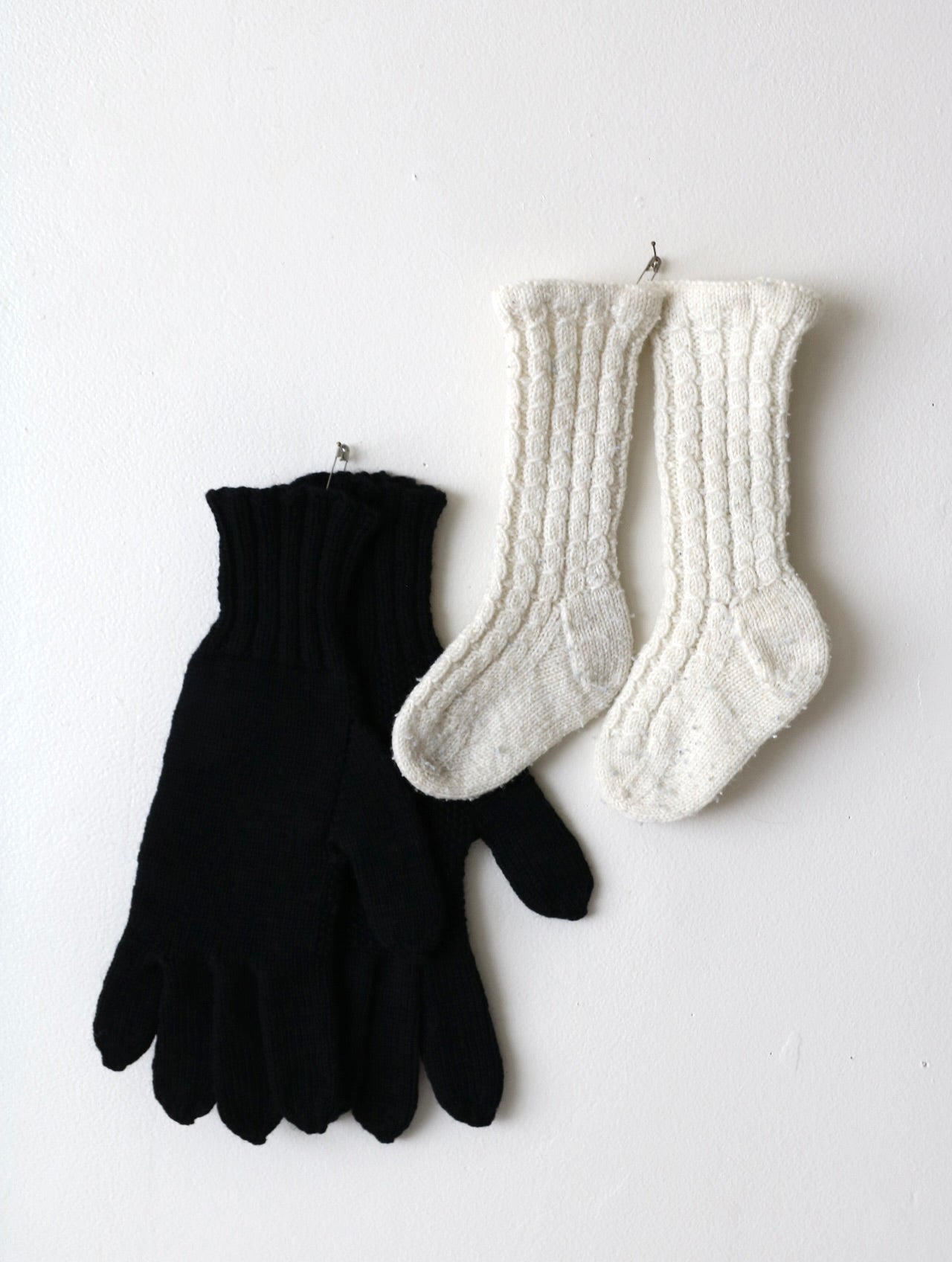 何年前のものだろう。どれだけ眠ってきたのだろう。サンプラーのように少女の手編みだろうか。手のひら側はグリップしやすいように編まれている。