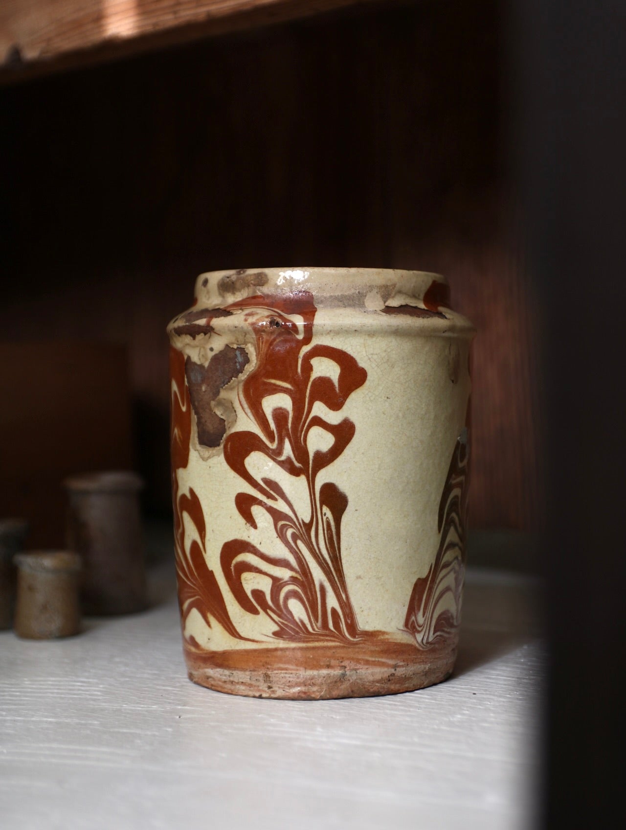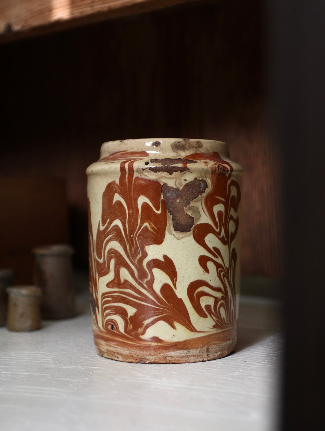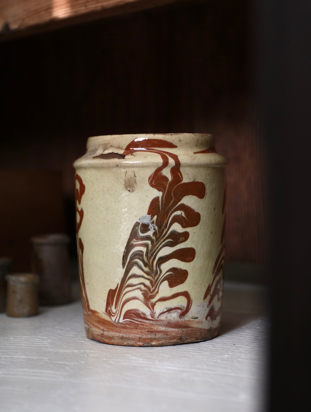 マーブルに混ざり合う南イタリア プーリアの保存容器。釉剥がれも景色として愉しみたい。size: Φ 12cm H 15.5cm Italy 19c____________