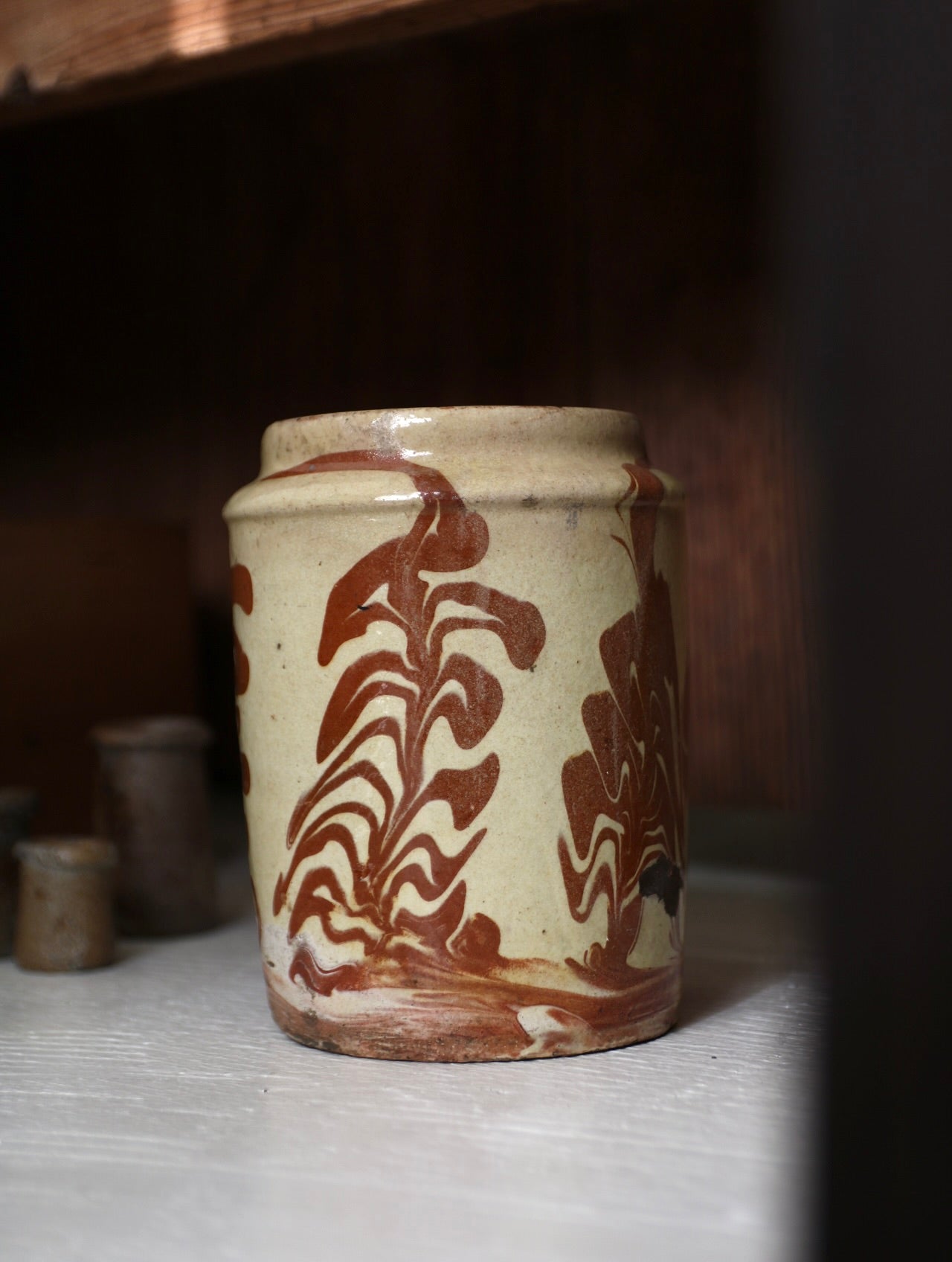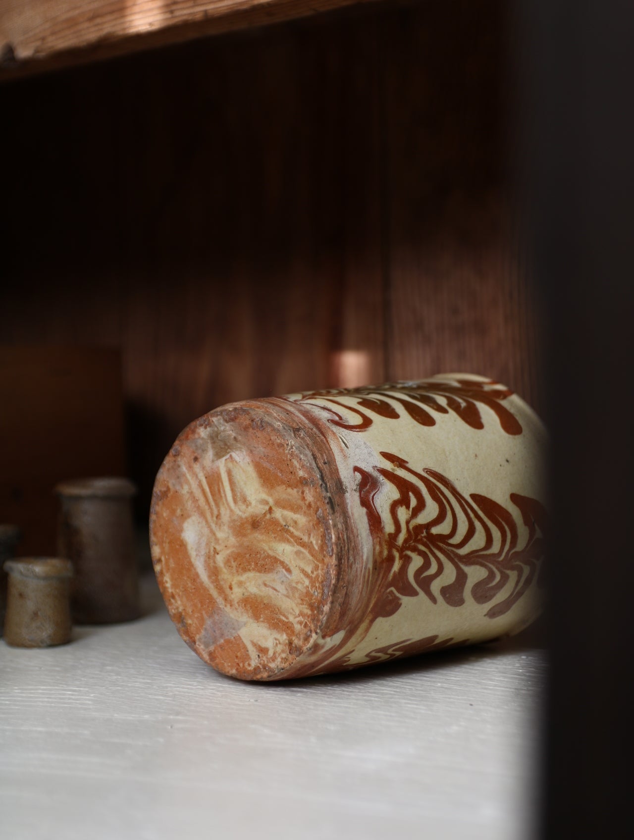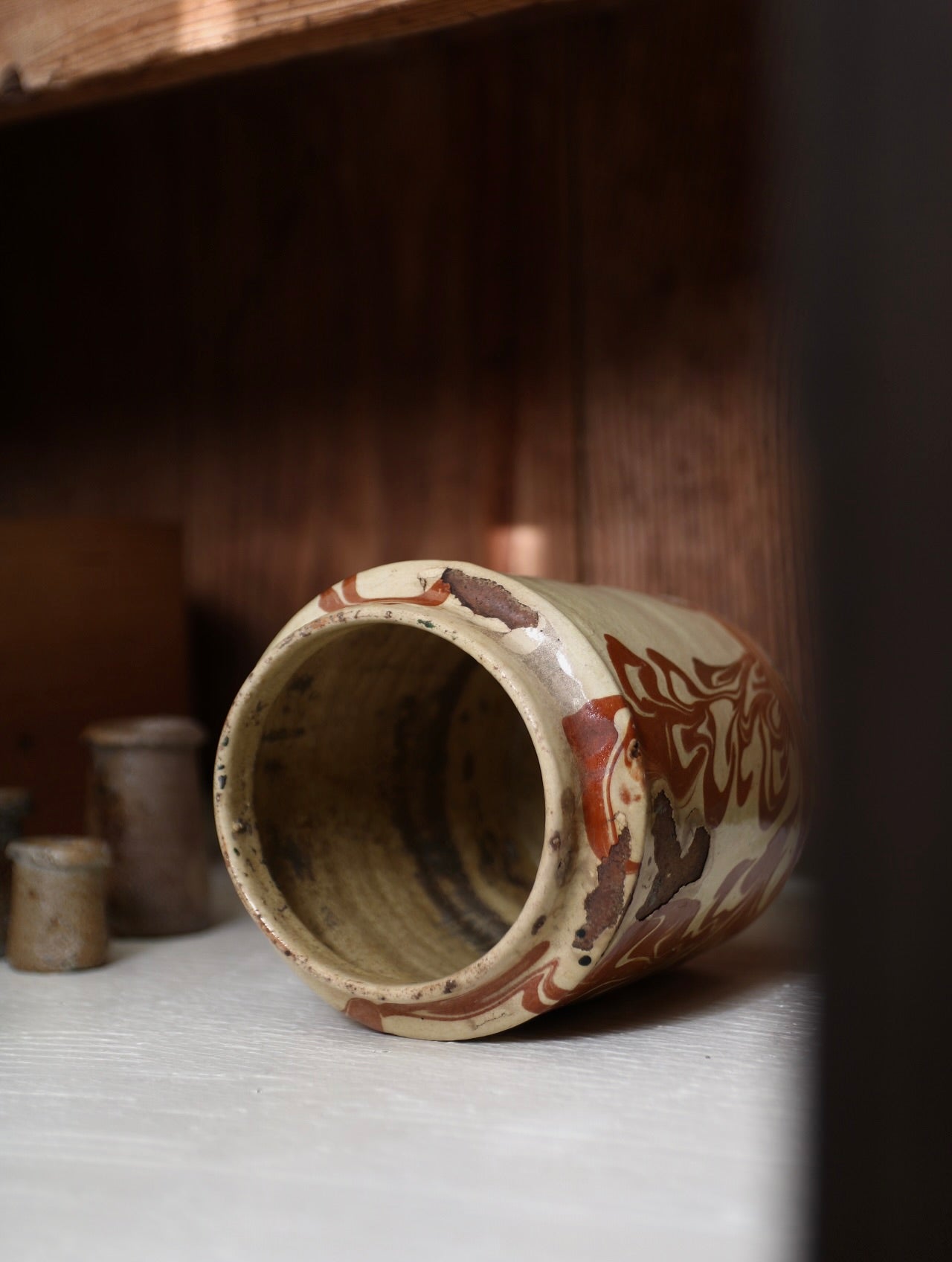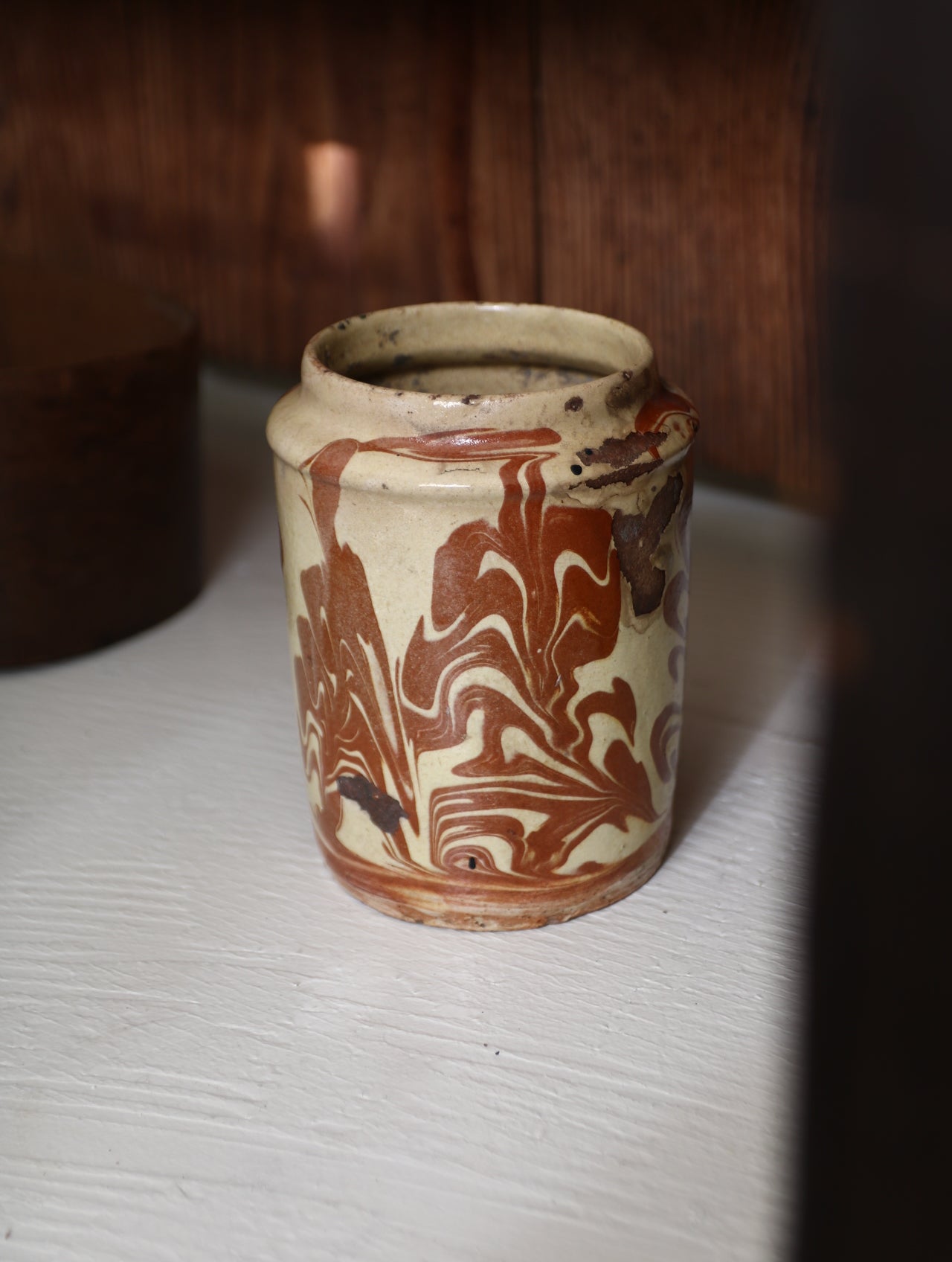 マーブルに混ざり合う南イタリア プーリアの保存容器。釉剥がれも景色として愉しみたい。size: Φ 12cm H 15.5cm Italy 19c____________